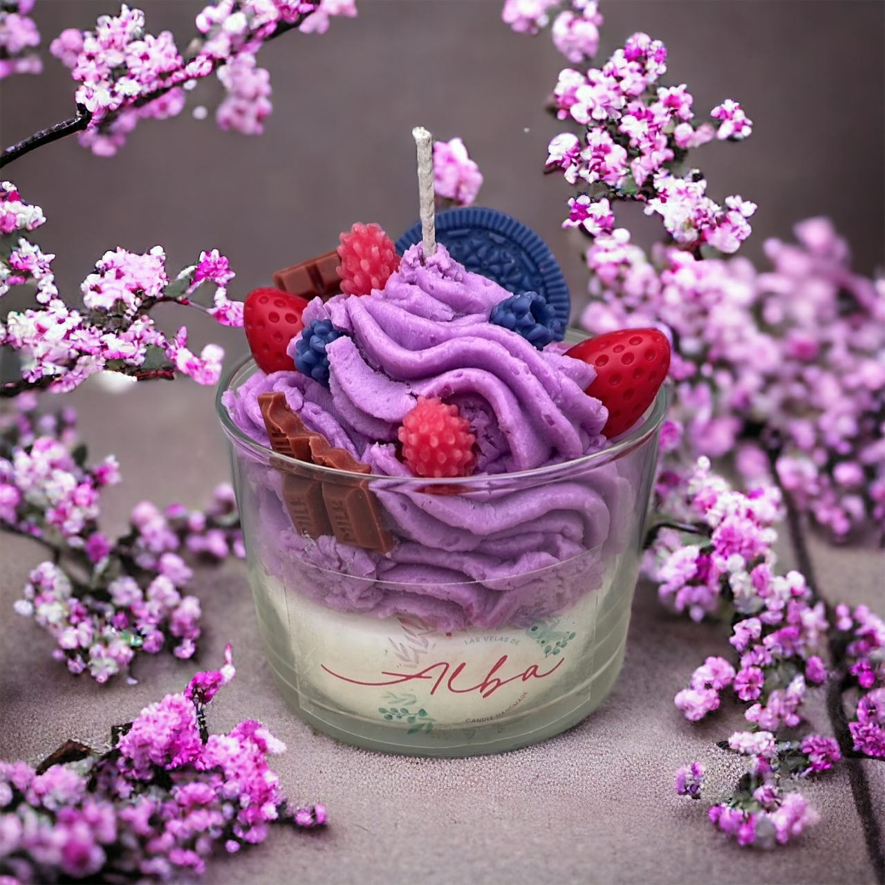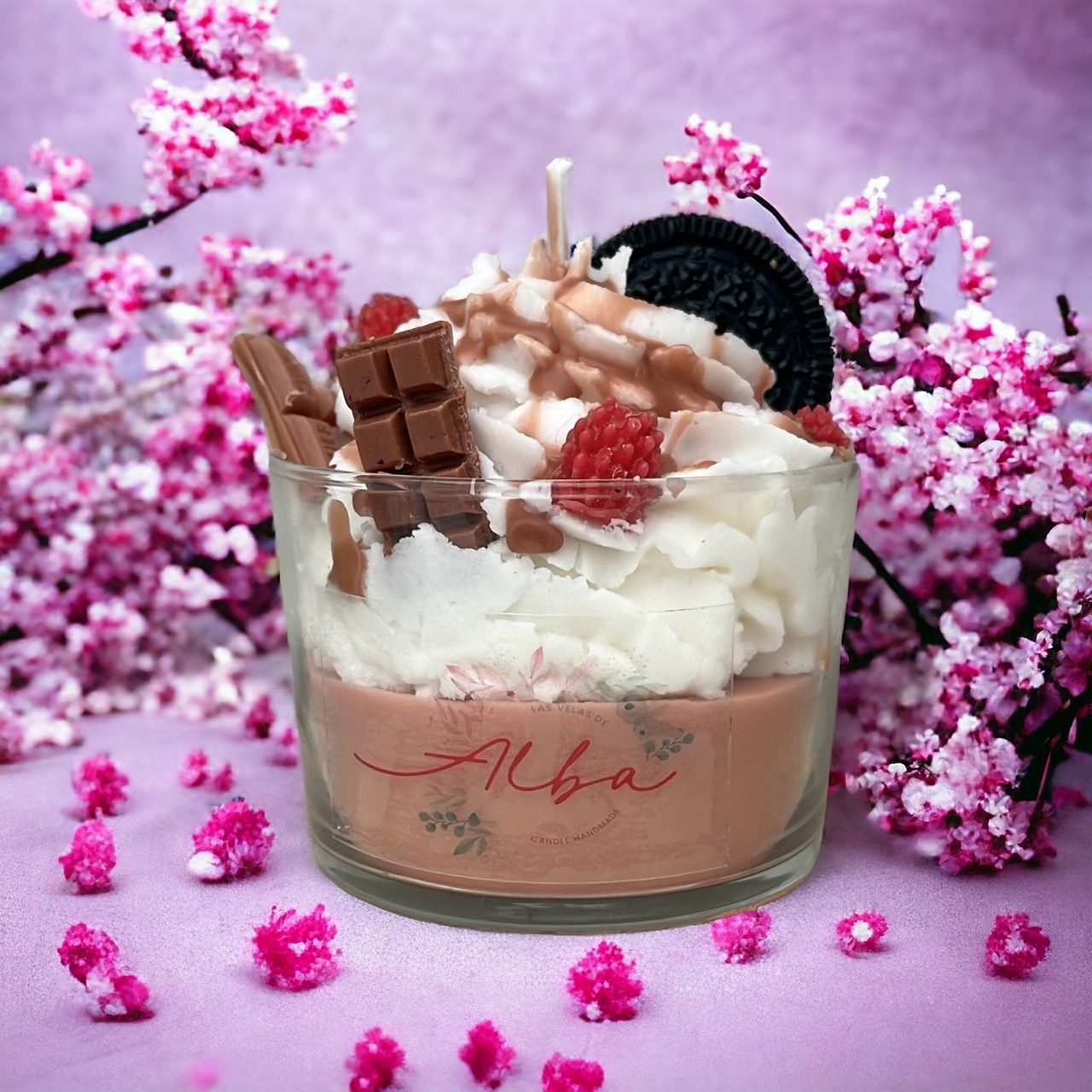 Vela postre aromática de cera de soja personalizable en aroma y color.