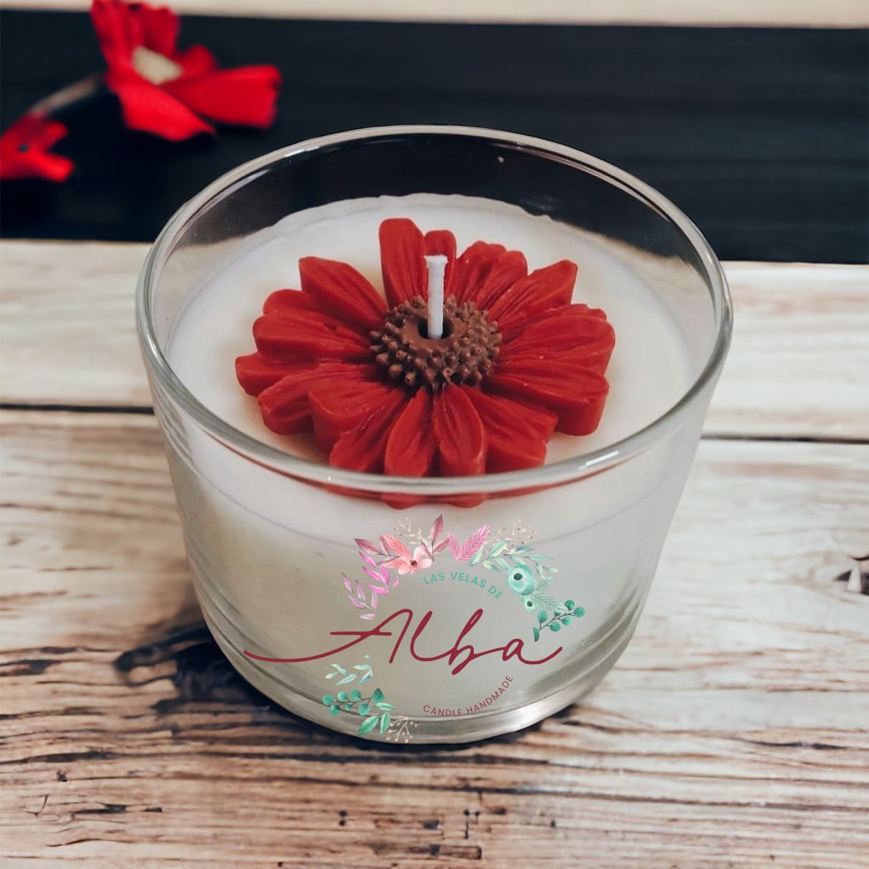Vela en vaso aromática de cera de soja personalizable en color y aroma tanto flor como vela. (El centro de la flor siempre será marrón)